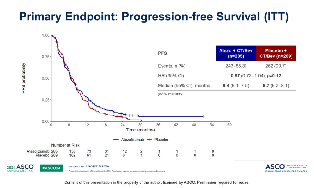 海德堡大学曼海姆医学院Frederik Marmé教授在2024 ASCO汇报了III期AGO-OVAR 2.29/ENGOT-ov34研究(NCT03353831)的最终分析结果:对于复发性卵巢癌患者,在单药非铂类化疗+贝伐珠单抗治疗中添加阿替利珠单抗时,未观察到生存获益增加(摘要LBA5501)。