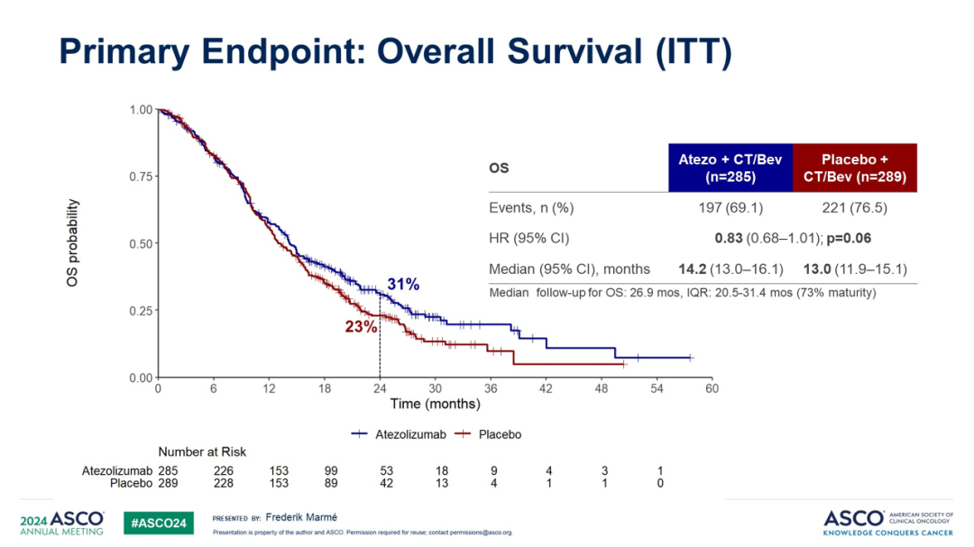 ENGOT-ov34研究发现,在88%的事件成熟度下,在化疗和贝伐珠单抗中添加阿替利珠单抗并没有改善无进展生存期:中位PFS在阿替利珠单抗组为6.4个月;在安慰剂组中为6.7个月,差异没有统计学显著性。在中位随访27个月时,添加阿替利珠单抗并没有显著改善总生存,OS呈现获益趋势,但p值为0.06,里程碑式24个月OS分析数据显示,阿替利珠单抗组和安慰剂组的2年OS率差异为8%(31%vs 23%),但OS曲线在观察结束前一直保持分离。