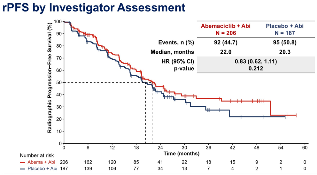 从2018年11月到2022年7月,共入组393名患者。组间基线特征一致。rPFS的主要终点未达到(HR 0.83;P=0.212),阿贝西利联合阿比特龙组的中位rPFS为22.0个月,安慰剂组为20.3个月。盲法独立中央审查的rPFS与研究者评估一致(HR 0.84)。OS是一个关键次要终点且未经假设检验(HR 0.93;成熟度38.9%)。其他次要终点包括PSA进展时间(HR 0.637)、症状进展时间(HR 0.768)和最严重疼痛进展时间(HR 0.935)。