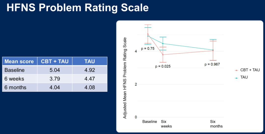 162名患者被随机分配(每组81人),117名回答了6个月HFNS问题评分。基线特征平衡。平均CBT交付依从性(delivery adherence)为85%。尽管在6周时观察到常规治疗组与CBT+常规治疗组间的差异(平均值4.47 vs.3.79,P=0.03),但6个月平均HFNS问题评分没有显著差异(平均值4.08 vs.4.04,P=0.97)。在6周时,CBT患者的每周HFNS频率更高(中位数54.2 vs.59.4,P=0.04),抑郁得分更低(中位数7.19 vs.6.19,P=0.03),焦虑得分更低(中位数4.25 vs.3.39,P=0.03)。CBT患者在6个月时关于开放性和幽默得分的信念更为积极(中位数4.92 vs.4.59,P=0.03)。在其他HFNS信念和行为、生活质量、焦虑、情绪、睡眠质量和治疗依从性上没有显著差异。