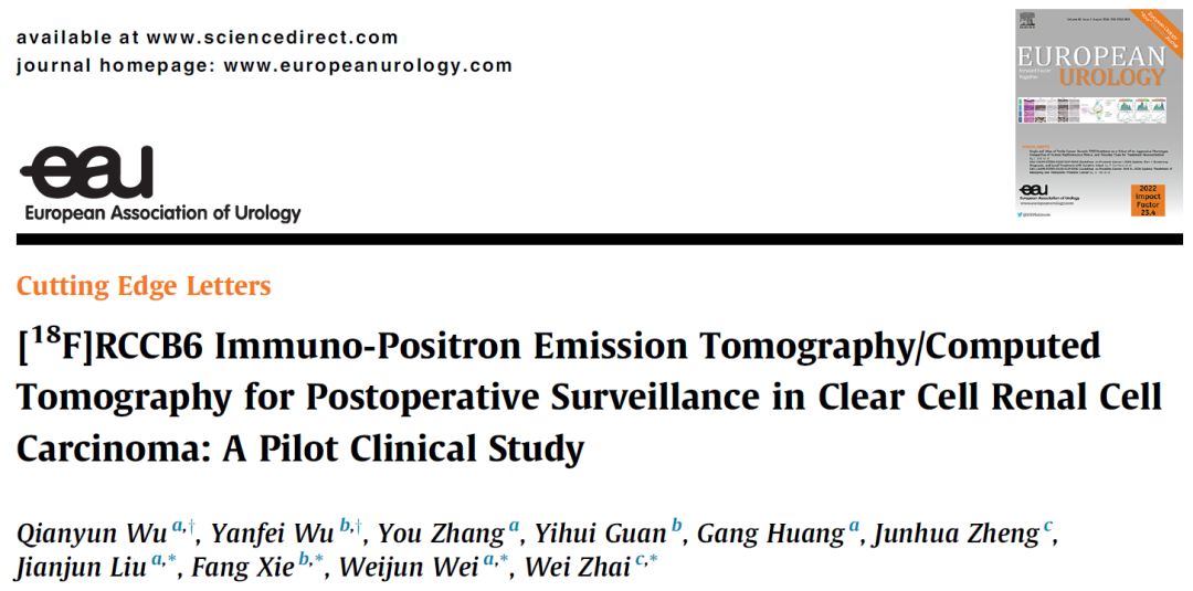 在泌尿外科顶刊《European Urology》(IF:25.3)杂志在线发表题为“[18F]RCCB6 immunoPET/CT in the postoperative surveillance of clear cell renal cell carcinoma:a pilot clinical study”的系列科研成果。