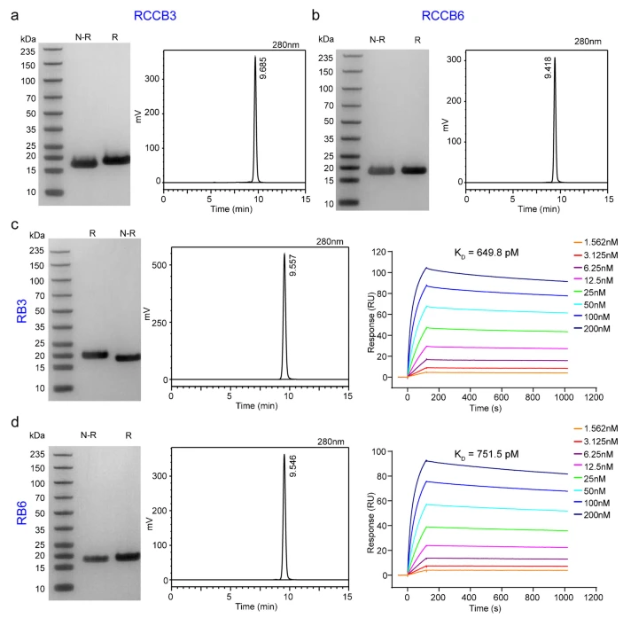 图1:靶向CD70单域抗体制备及体外表征。(a,b)RCCB3和RCCB6的SDS-PAGE和HPLC结果。(c,d)RB3和RB6的SDS-PAGE(左图)、HPLC(中间图)和SPR亲和力测定结果(右图)。